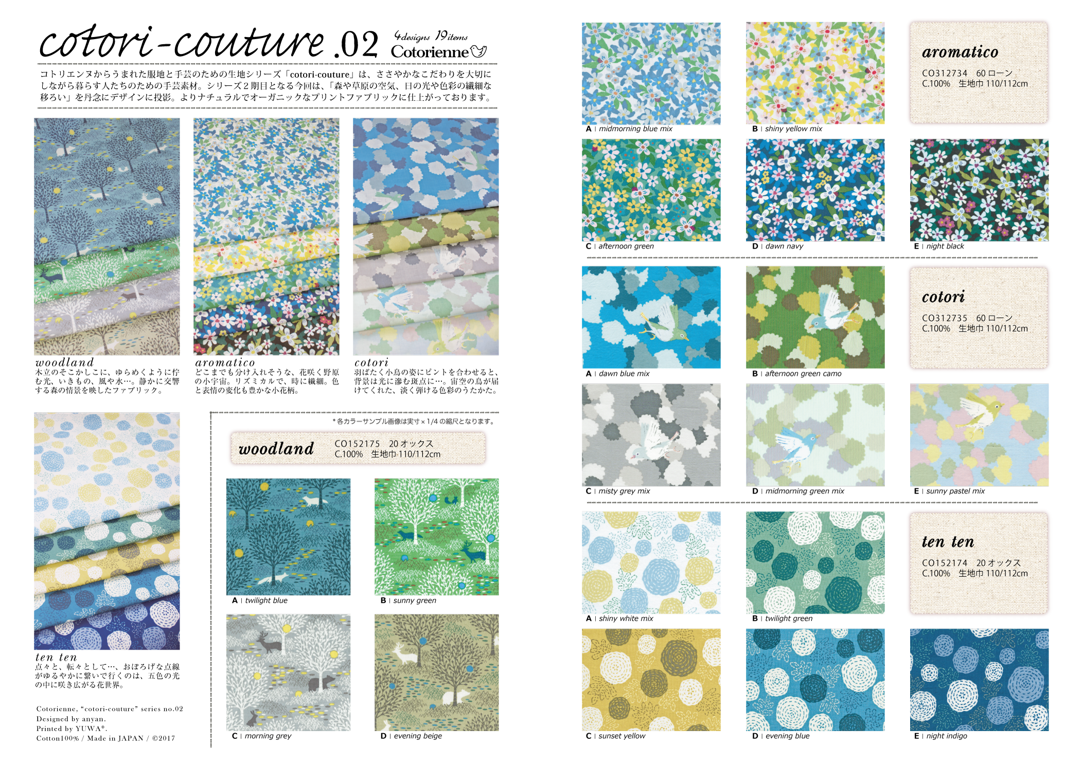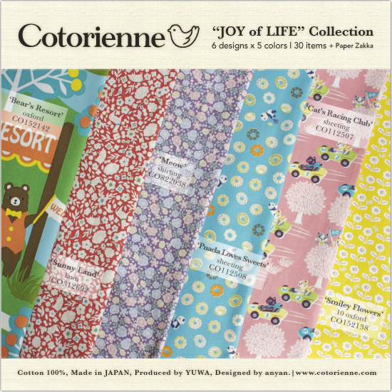 Cotorienneのデビューコレクション。花鳥風月、物語、少女、といったデザイナーアニャンおなじみのモチーフに、水玉、格子、小花といった布地の定番モチーフを加えた9つの絵柄。 優しく穏やかな色合いと雰囲気の中に、ファンタスティックな浮遊感を感じさせるコレクションとなりました。