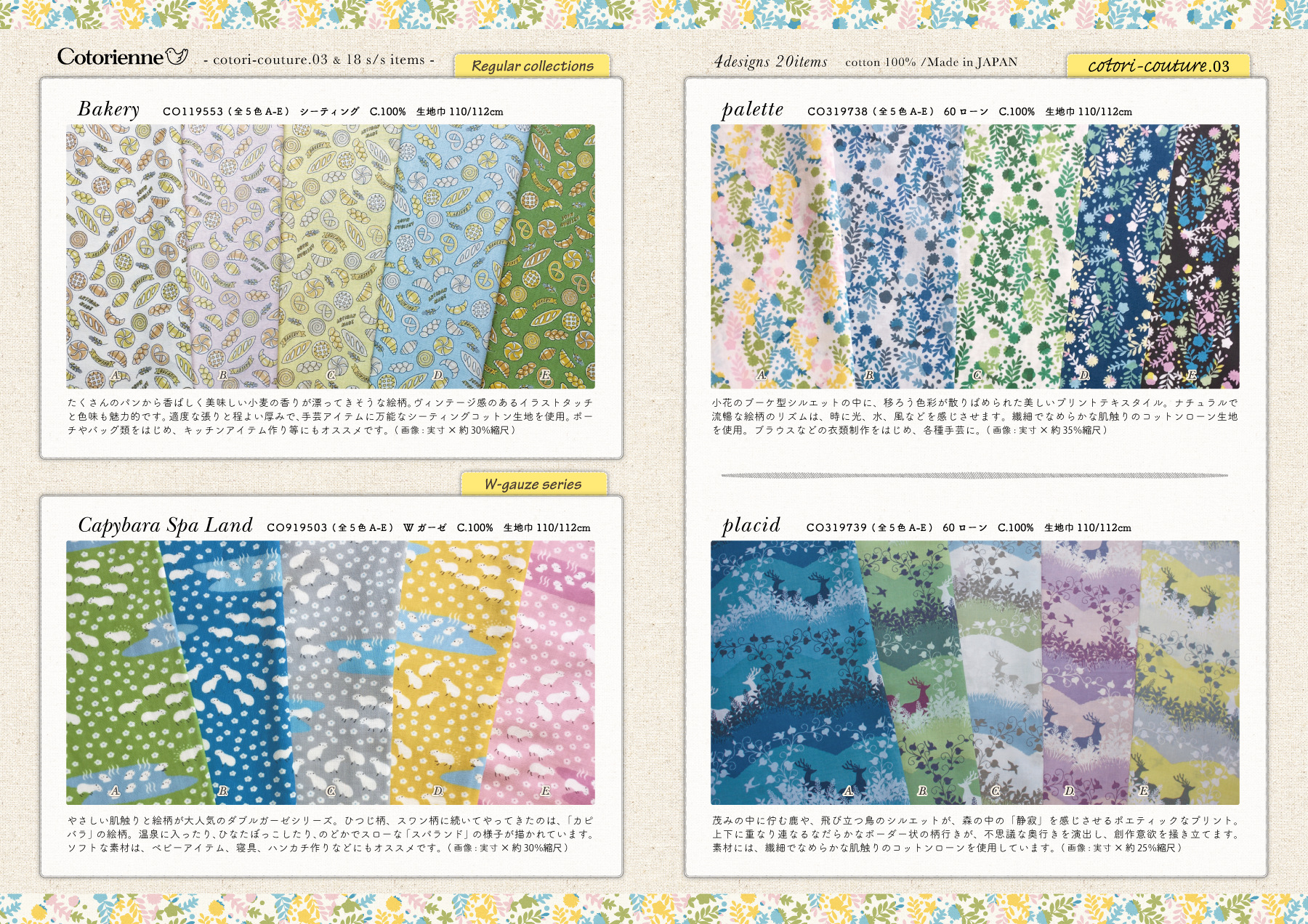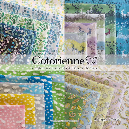 モダンナチュラルなデザインが特徴の「cotori-couture」シリーズ(ささやかなこだわりを大切にしながら暮らす人たちのための手芸素材)に加え、 人気のダブルガーゼシリーズ、マルチに使えるパンの絵柄生地。コトリエンヌの魅力が詰まったアソートコレクションです。様々なライフシーンにてご活用下さい。