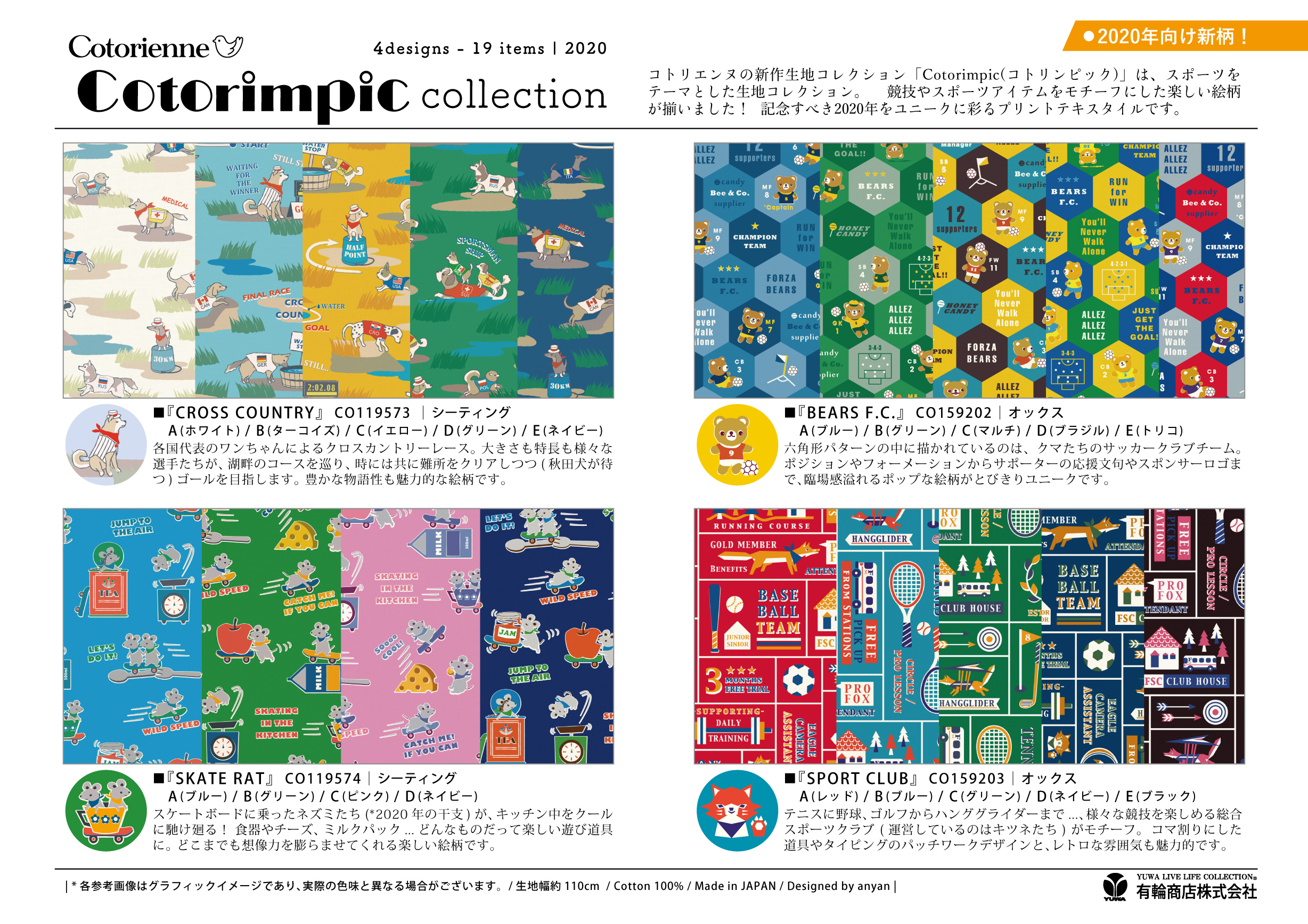 「Cotorimpic collection (コトリンピックコレクション) 」は、スポーツをテーマとした生地コレクション。 競技やスポーツアイテムをモチーフにした楽しい絵柄が揃いました。 動物キャラクターたちと、物語性とユーモア溢れるオリジナルデザインの掛け合いも魅力的です。