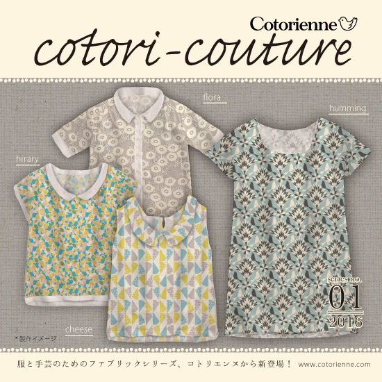 Cotorienneの生地シリーズ「cotori-couture」は、モダンナチュラルなデザインが魅力のファブリック。ささやかなこだわりを大切にしながら暮らす人たち のための手芸素材です。ブラウス、シャツ、ワンピース等の服地素材をはじめ、各種ソーイングアイテム作りにご活用ください。